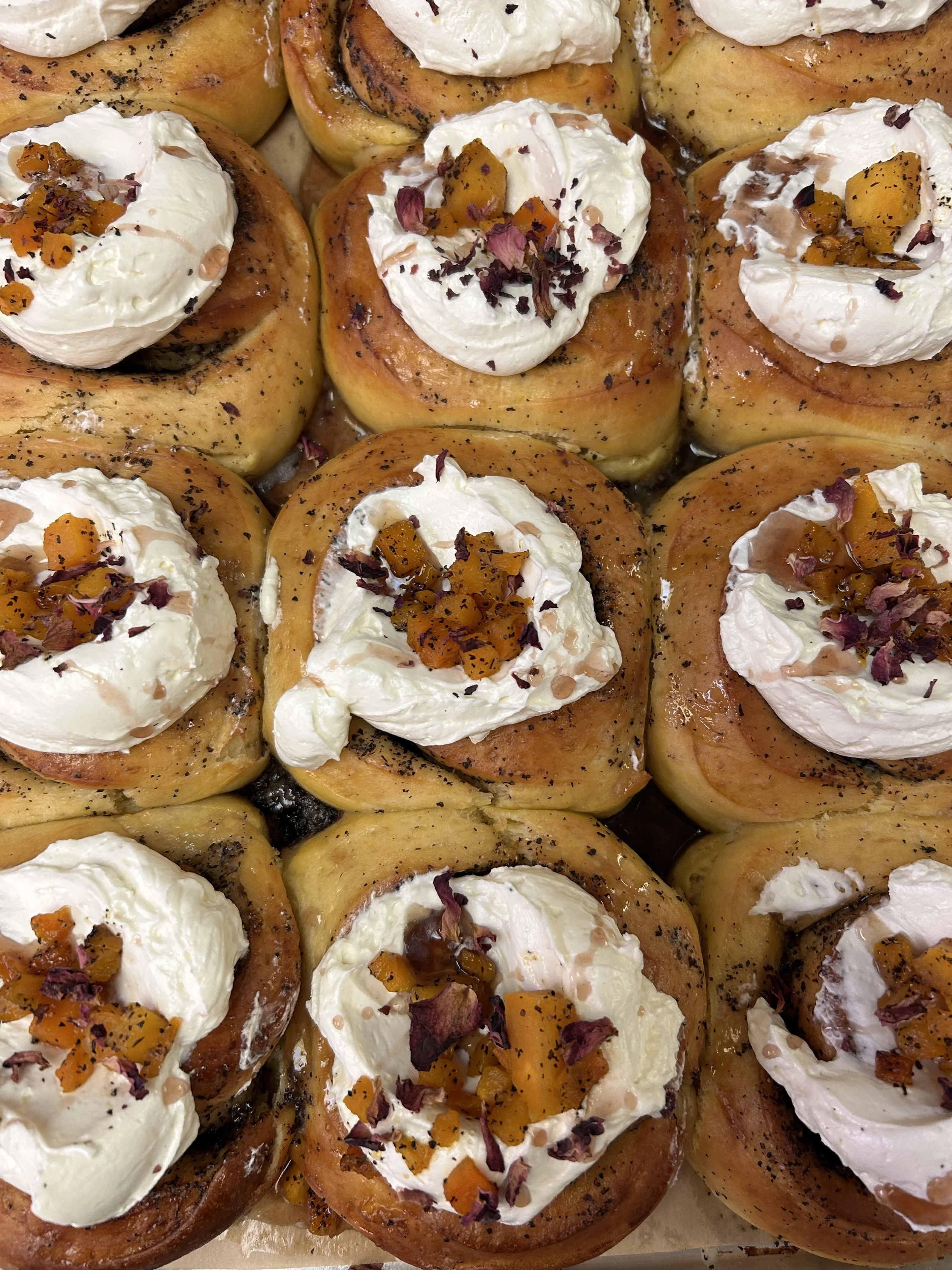 EARL GREY: EARL GREY CAKE, RASPBERRY POACHED PEAR FILLING, BURNT HONEY MOUSSE, SALTY VANILLA BEAN SWISS BUTTERCREAM